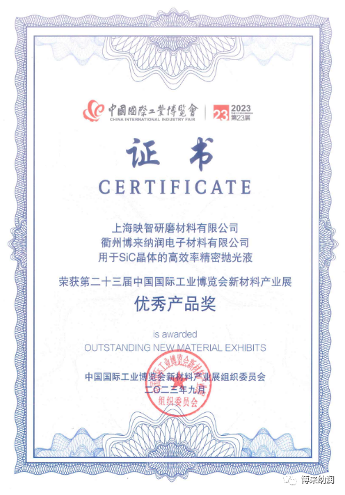 2023年9月19日至23日,第23屆中國國際工業(yè)博覽會(huì)(以下簡稱“工博會(huì)”)新材料新產(chǎn)業(yè)展在國家會(huì)展中心(上海)舉行。展會(huì)以“碳循新工業(yè),數(shù)聚新經(jīng)濟(jì)”為主題,圍繞制造業(yè)低碳化發(fā)展、數(shù)字化轉(zhuǎn)型的時(shí)代新趨勢,打造國際化、開放性、高水平的全球產(chǎn)業(yè)合作交流平臺。作為半導(dǎo)體材料國產(chǎn)化替代的踐行者,博來納潤也參加了本次的工博會(huì),我們的產(chǎn)品“用于SiC晶體的高效率精密拋光液”榮獲“第二十三屆中國國際工業(yè)博覽會(huì)新材料產(chǎn)業(yè)展優(yōu)秀產(chǎn)品獎(jiǎng)”。
